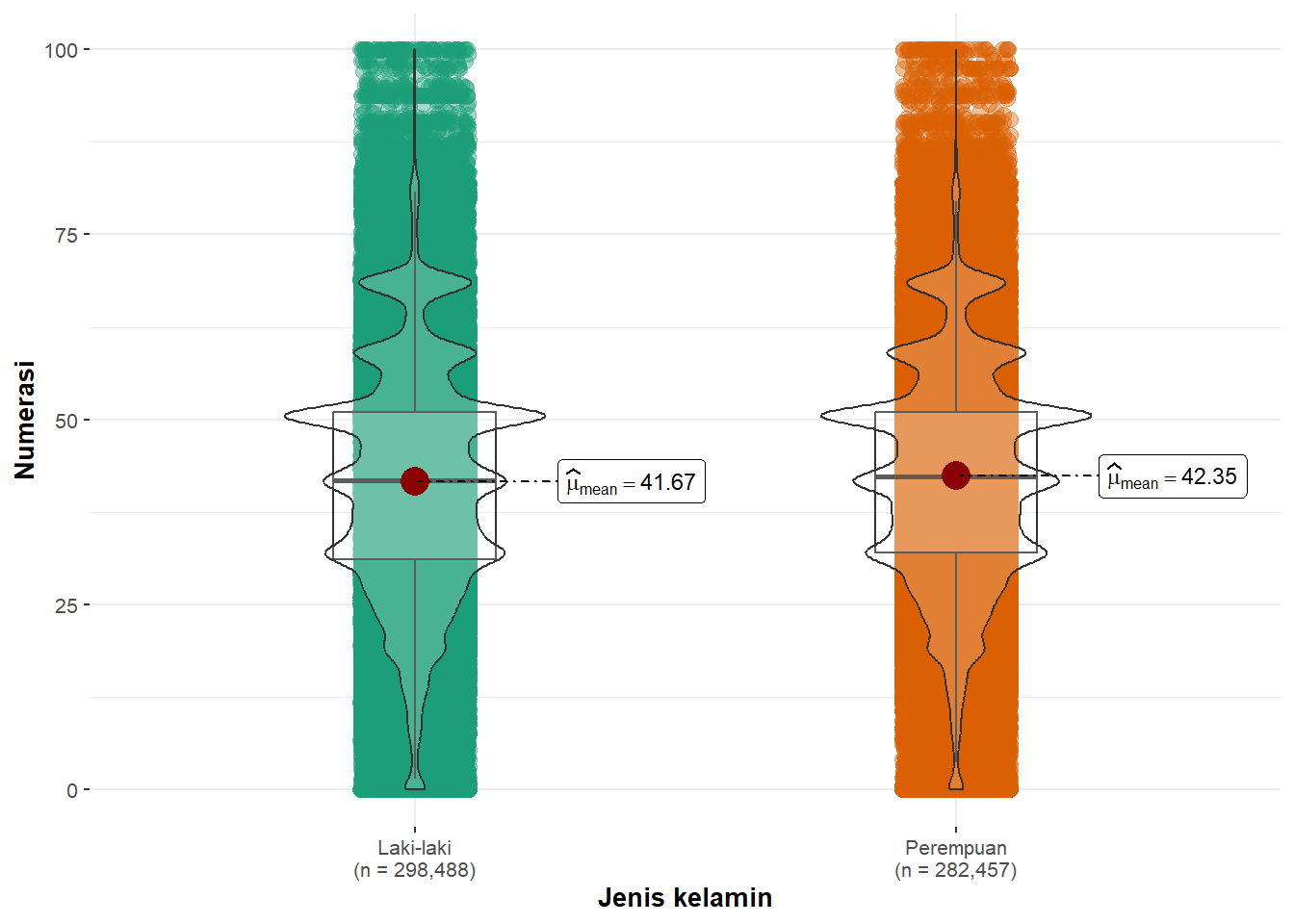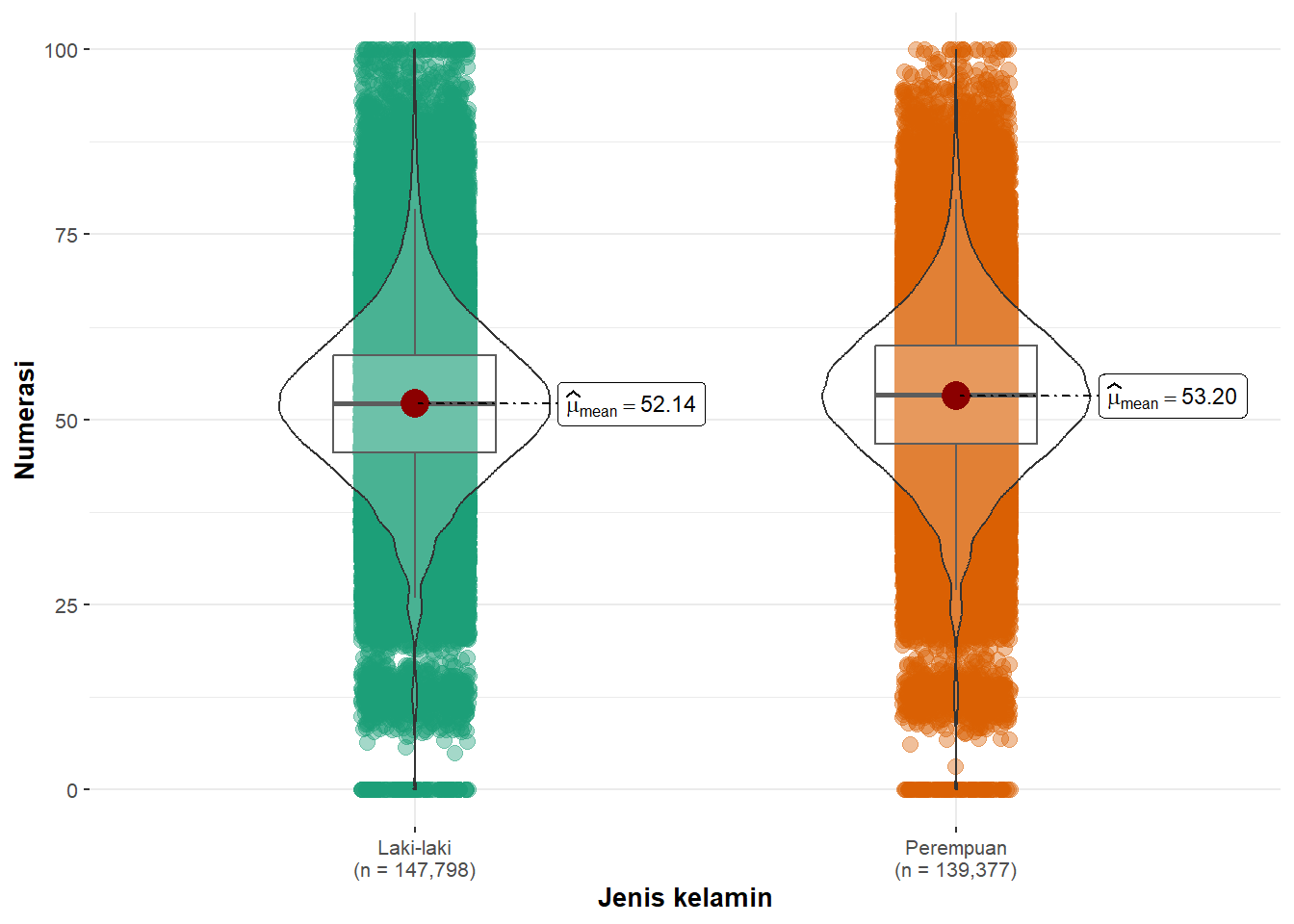Pada tahun 2021 rata-rata skor numerasi siswa laki-laki dan perempuan tidak jauh berbeda. Meski demikan, rata-rata skor numerasi siswa perempuan lebih tinggi dibandingkan rata-rata skor numerasi siswa laki-laki.