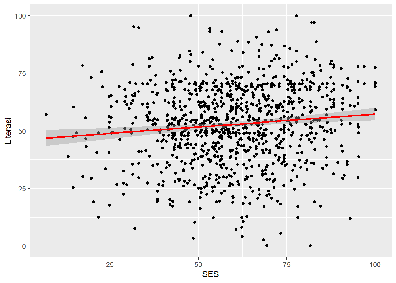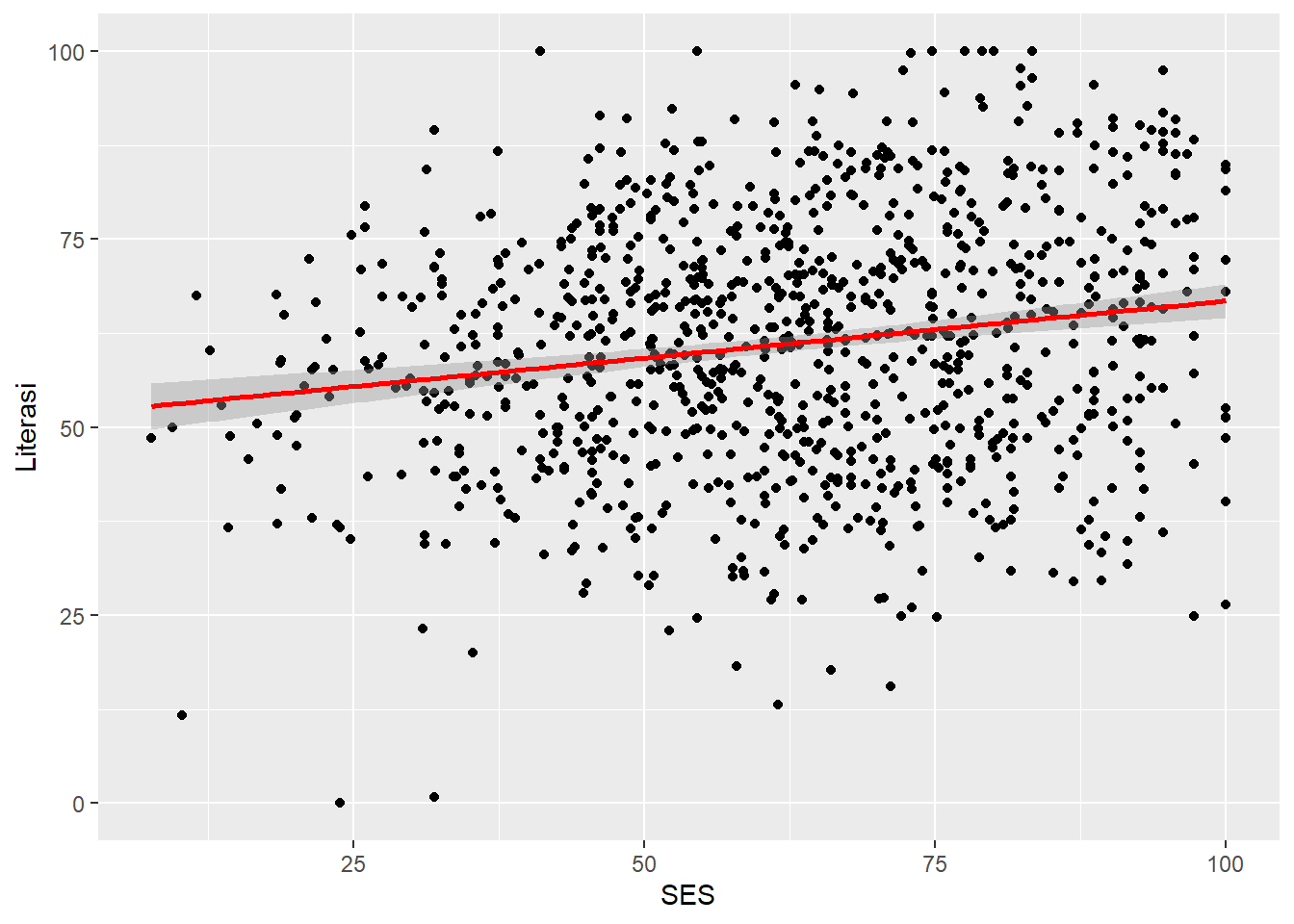 @scatter-1 menunjukkan garis diagonal miring ke kanan yang berarti terdapat hubungan positif antara indeks status sosial ekonomi (SES) dengan literasi siswa.
