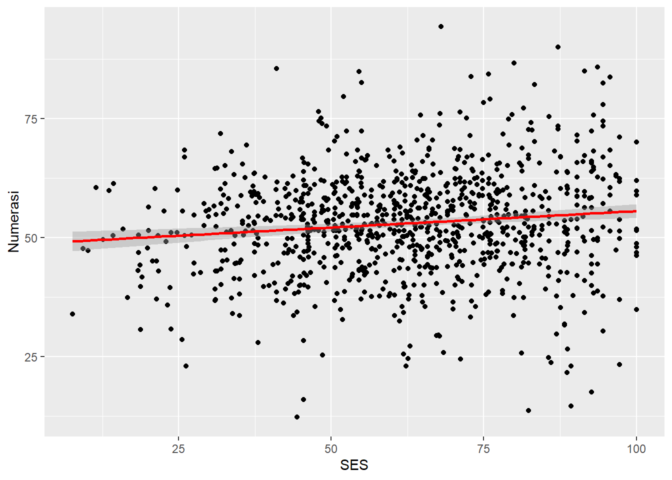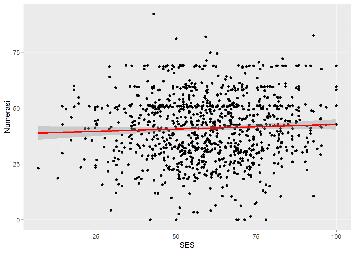 @scatter-4 menunjukkan garis diagonal miring ke kanan yang berarti terdapat hubungan positif antara indeks status sosial ekonomi (SES) dengan numerasi siswa.