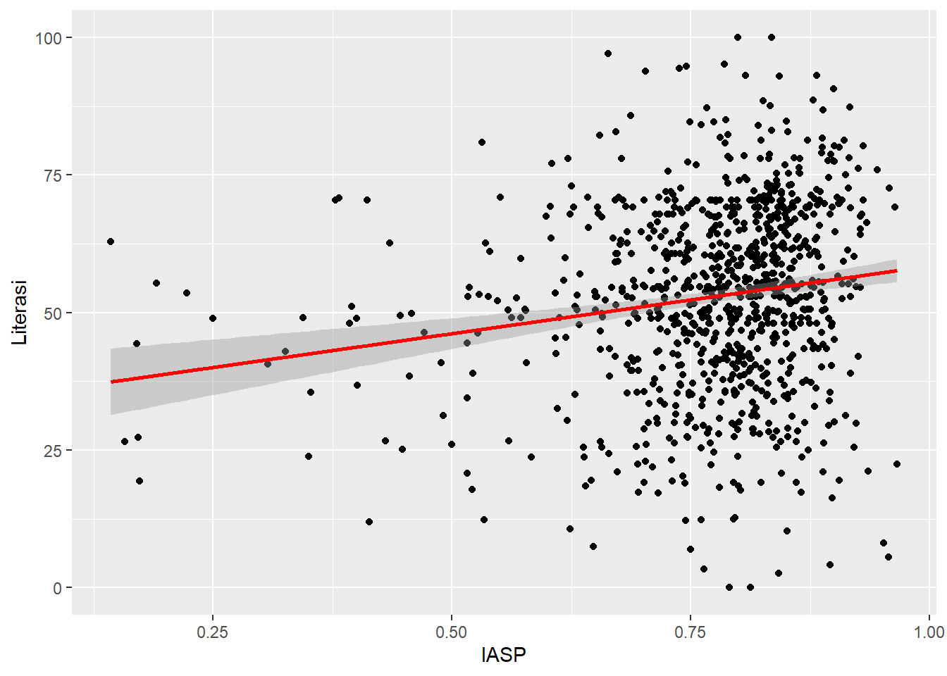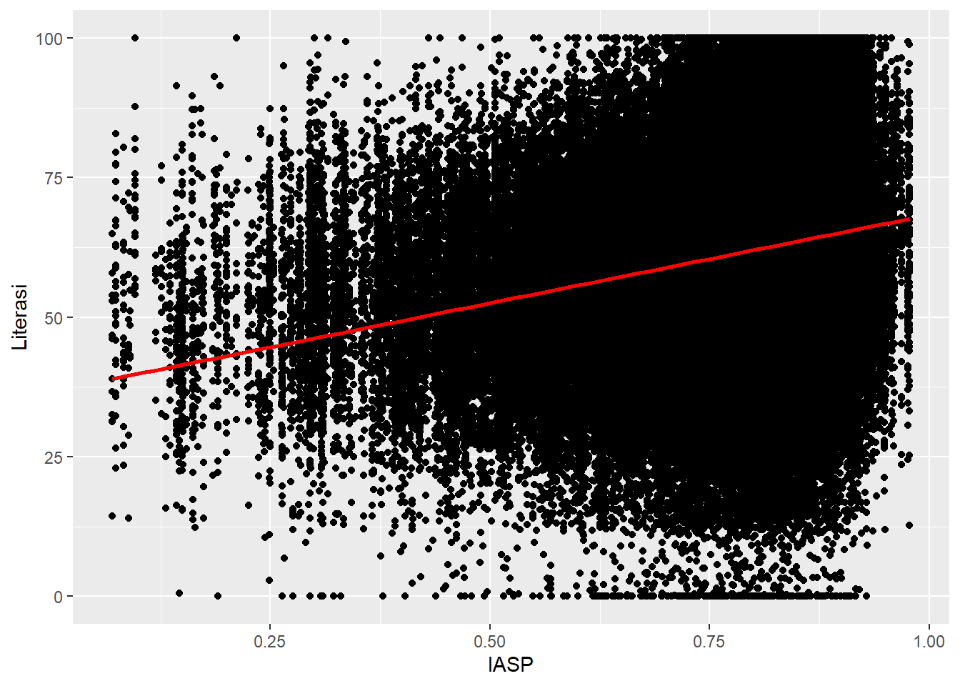 @scatter-6 menunjukkan garis diagonal miring ke kanan yang berarti terdapat hubungan positif antara indeks kemudahan akses (IASP) dengan literasi siswa.