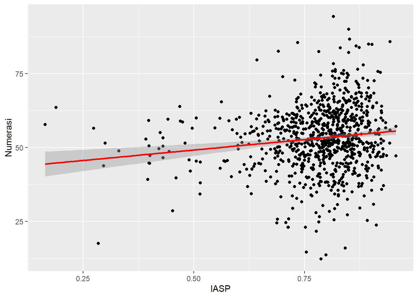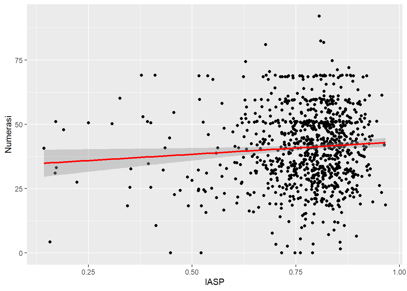 @scatter-8 menunjukkan garis diagonal miring ke kanan yang berarti terdapat hubungan positif antara indeks kemudahan akses (IASP) dengan numerasi siswa.